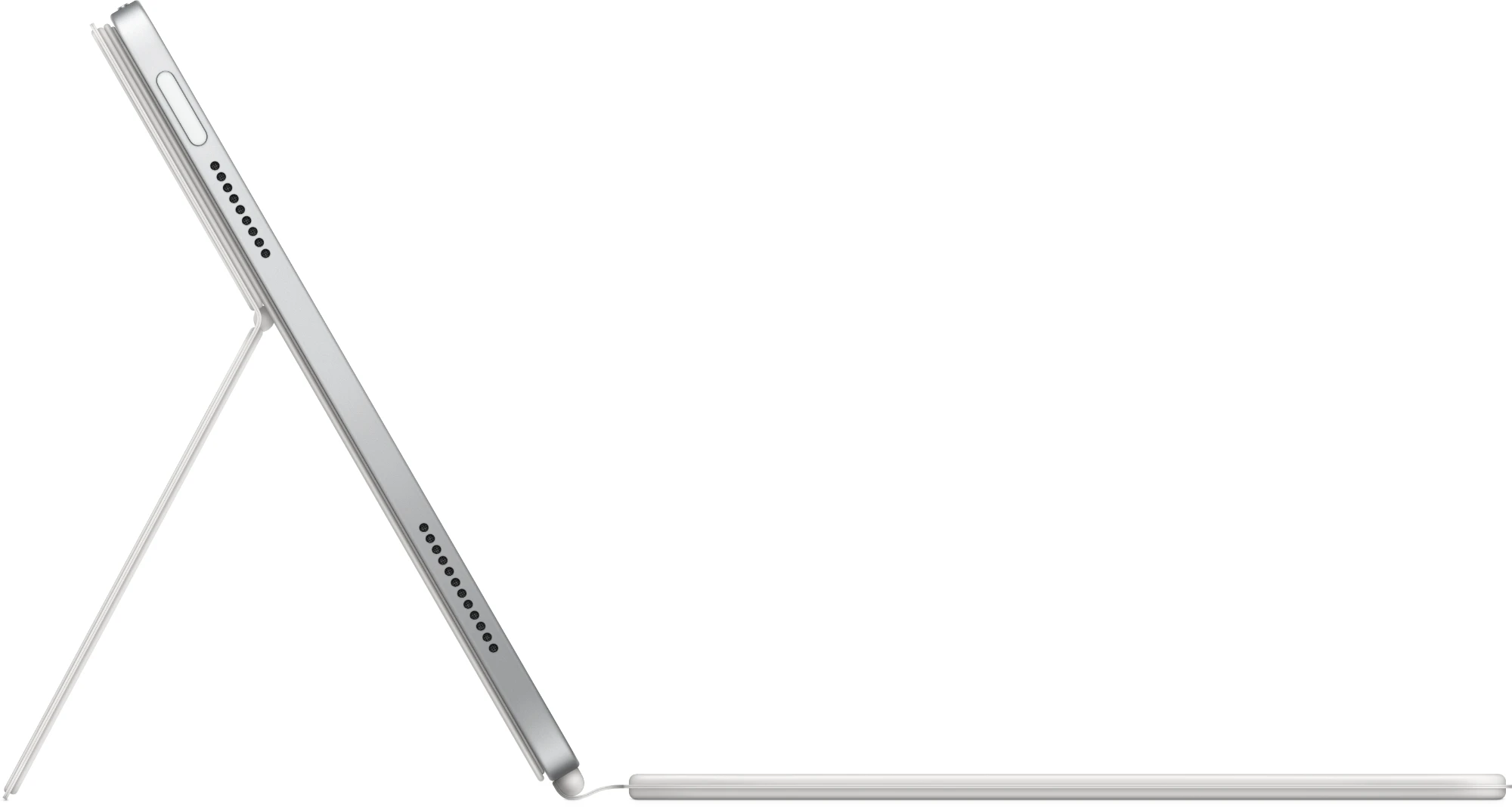 Mit dem Magic Keyboard Folio kannst du angenehm tippen und mit einem großen Trackpad arbeiten. Pass schnell die Lautstärke an oder such eine Datei über die Reihe mit Funktionstasten. Das flexible zweiteilige Design kommt mit einer abnehmbaren Tastatur. Die schützende Rückseite hat eine verstellbare Stütze für verschiedene Betrachtungswinkel