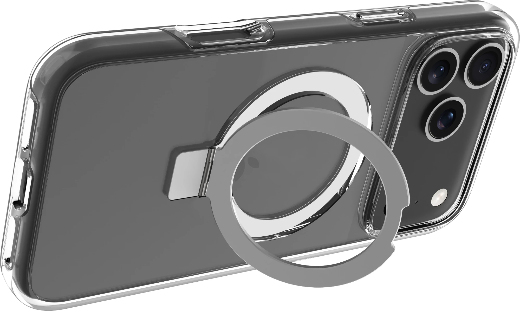 Integrierter MagSafe-Magnet, der nicht nur nahtloses kabelloses Laden und volle Kompatibilität mit MagSafe-Zubehör ermöglicht, sondern auch einen verstellbaren Ständer, der sowohl horizontale als auch vertikale Blickwinkel unterstützt.