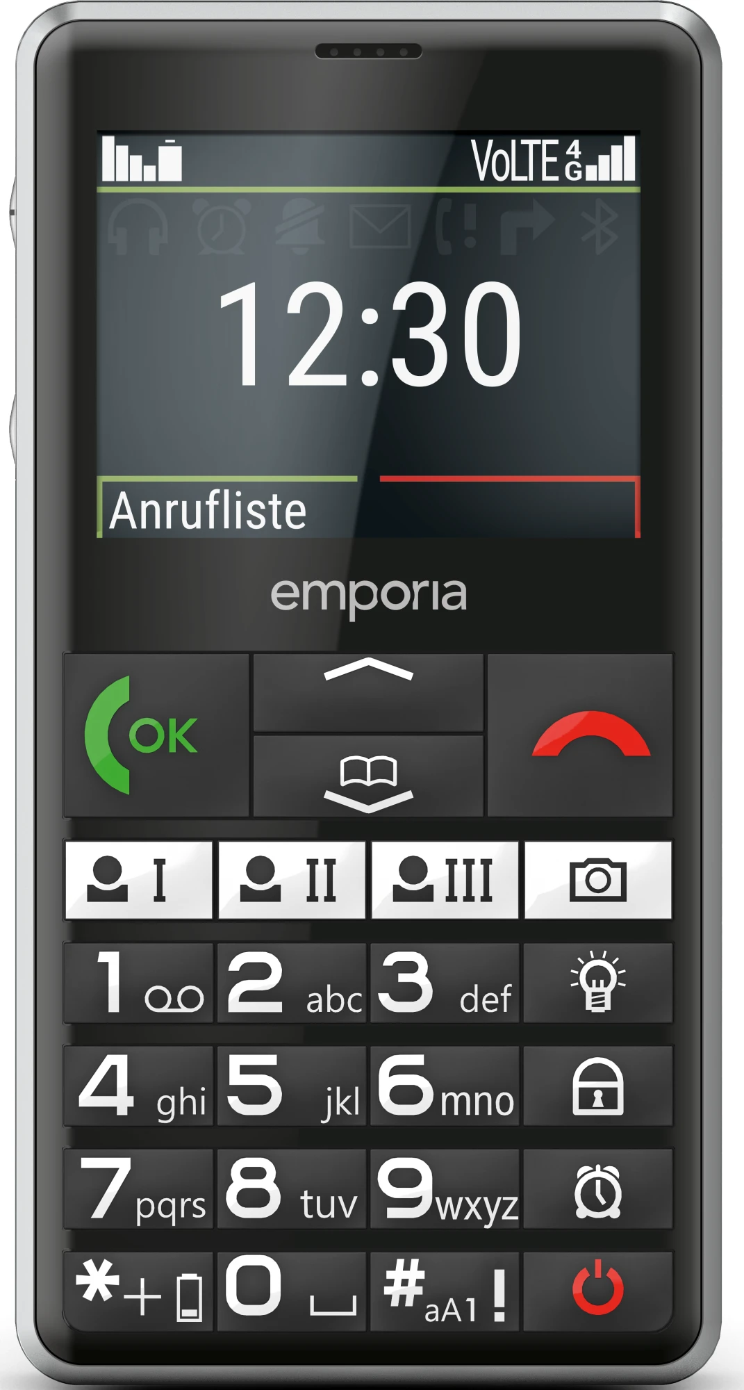 Und das ist längst nicht alles, was dieses Seniorenhandy, das auch kompatibel mit Hörgeräten (HAC M4/T4) ist, mitbringt: Das große Farbdisplay bietet beispielsweise noch genügend Platz für die übersichtliche Darstellung aller Informationen und des Menüs. Die rechte Tastenspalte ermöglicht den direkten Zugriff auf die Taschenlampe, die Kamera und den Wecker. Und ganz unten befindet sich der Ein/Aus-Schalter. Somit ist dieses Seniorenhandy eine perfekte Wahl für alle, die gerne mit Kurzwahltasten arbeiten oder ein Hörgerät tragen.